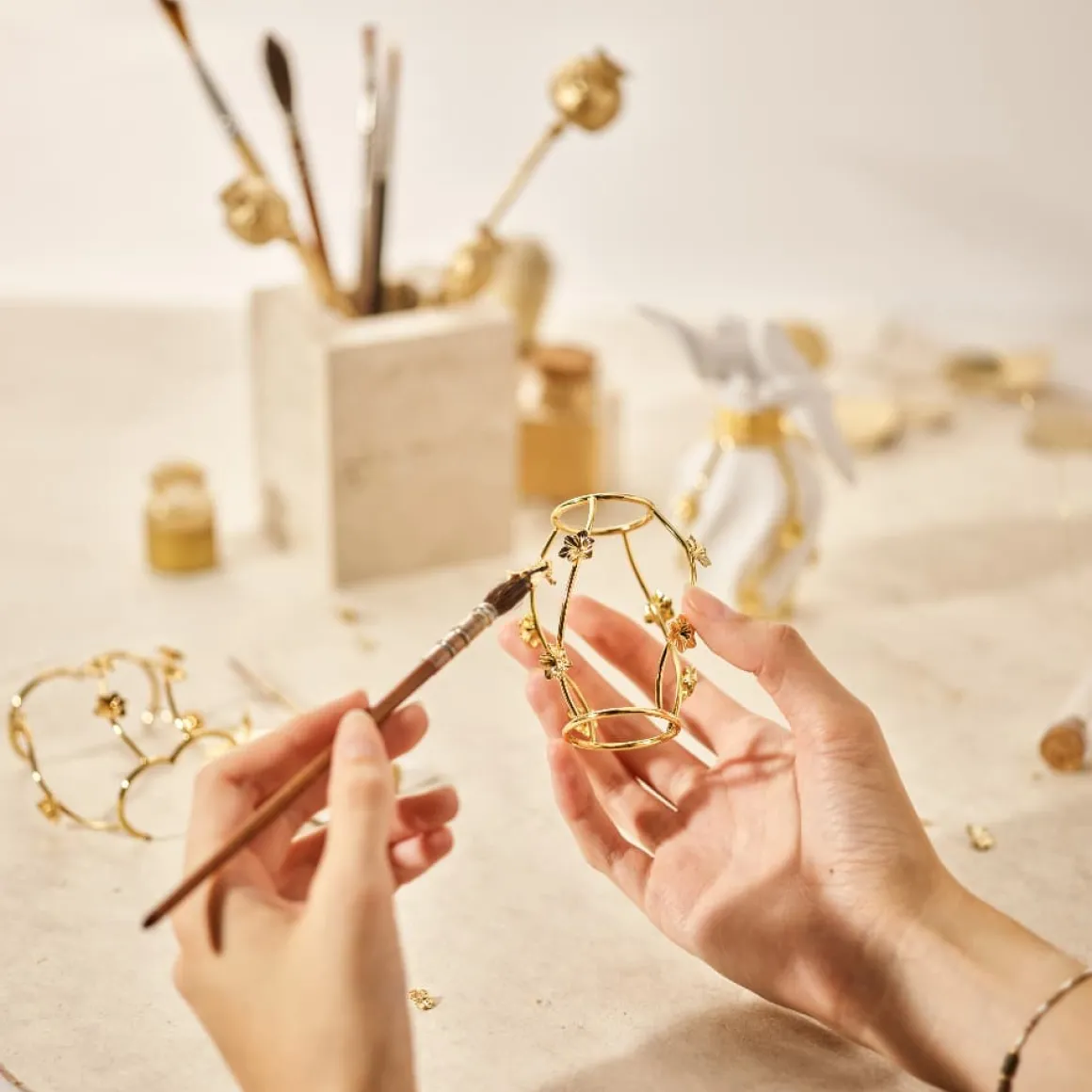 Anne Brun et son savoir-faire exceptionnel dans l’art de la dorure ont permis une réinterprétation unique de L’Air du Temps de Nina Ricci. Entouré d’une délicate cage aux fleurs dorées, détails signatures de l’artiste, et lacqué d’un blanc mat, le flacon devient un véritable objet d’art.