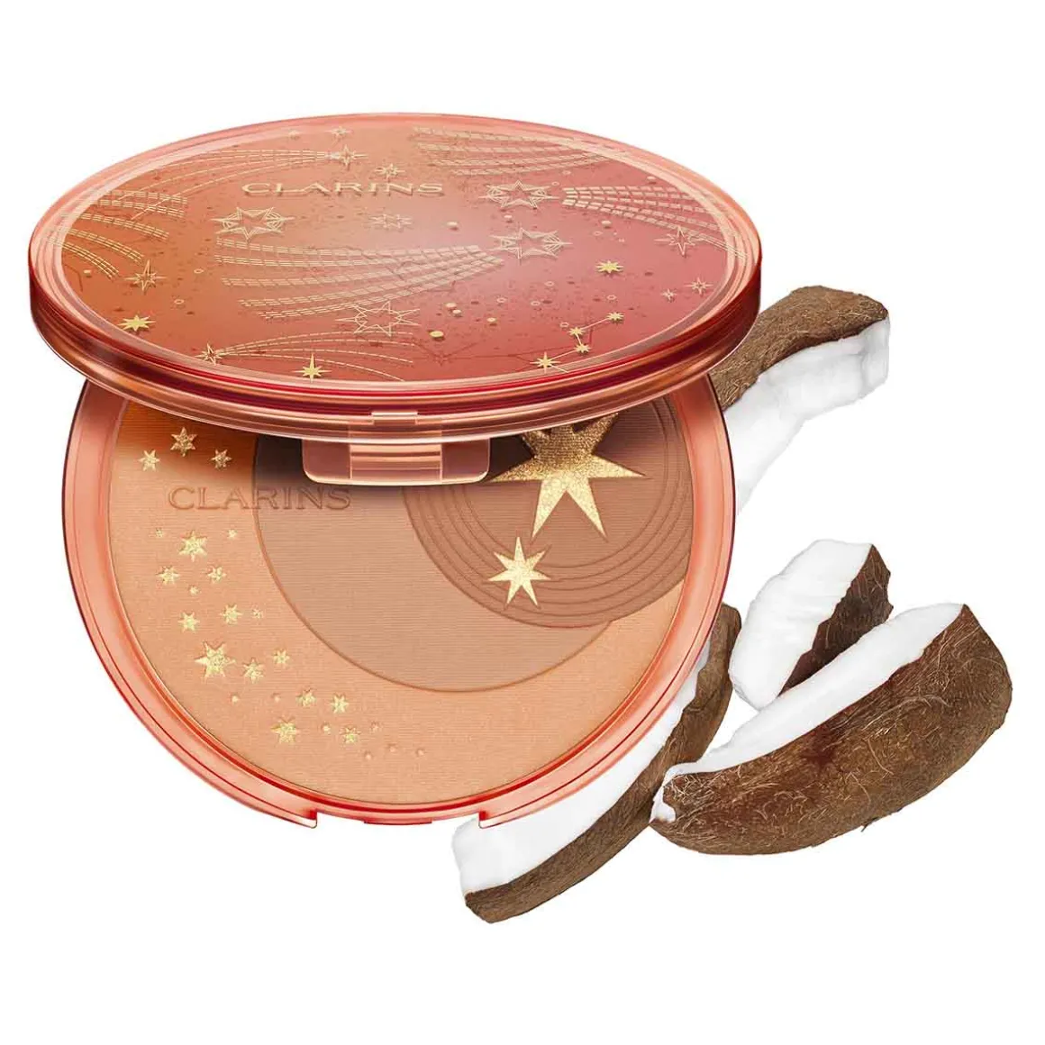 NOT JUST make up* Cette poudre de soleil est idéale pour un effet bonne mine immédiat. Idéale, pour être aussi solaire que l’astre du jour, elle permet d’obtenir un teint subtilement hâlé, unifié et rayonnant. Son boitier au désign astral exclusif ainsi que son grand miroir permettent les retouches à tout moment de la journée, en balade, sur la plage ou en terrasse le soir ! Sa texture poudre ultra-fine, fusionne avec la peau et libère un doux parfum envoutant aux senteurs d’après-soleil addictives ! Edition limitée. Une formule soin composée à 96% d’ingrédients d’origine naturelle : gorgée d’huile de noix de coco bio pour l’ultra confort et parée du complexe anti-pollution Clarins, qui contribue à protéger la peau des méfaits de la pollution. Elle est aussi enrichie d’un extrait de carthame (plante bio), pour aider à intensifier le bronzage, de quoi prolonger le bonheur des vacances. *Plus que du maquillage