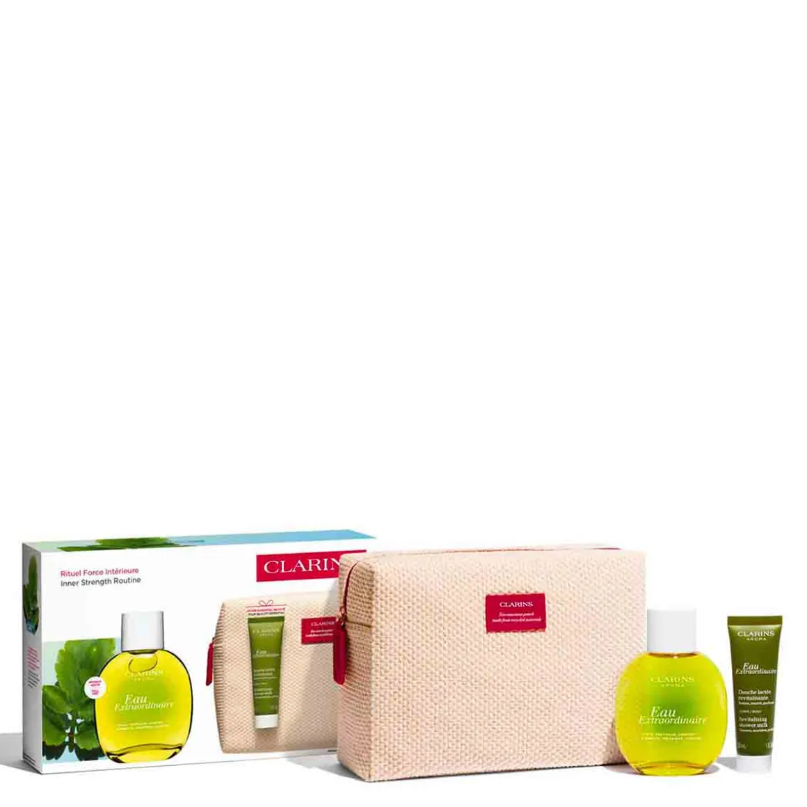 Ce coffret réunit dans une grande trousse l’Eau Extraordinaire, la toute dernière Eau de Soins Clarins, et une crème de douche au parfum revitalisant de l’Eau Extraordinaire formulée avec de l’huile d’amande douce bio. Ce Rituel Force intérieure parfume, ravive la force intérieure et éveille les sens. Leur parfum vous transporte au cœur de l’univers végétal Clarins et invite à la reconnexion avec soi-même.