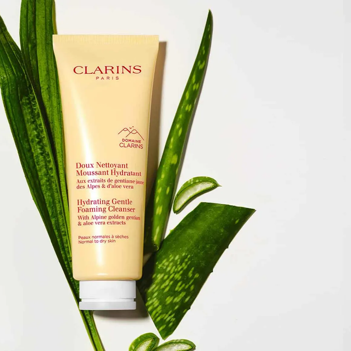 Les démaquillants Clarins, le 1er geste beauté aux extraits de plantes. Ce nettoyant moussant enrichi aux extraits d’herbes des Alpes du Domaine Clarins démaquille, hydrate les peaux normales à sèches et élimine les impuretés tout en préservant l’équilibre cutané. Une nouvelle texture crémeuse réconfortante qui se transforme en une mousse douce et fine. Enrichi d’un extrait d’aloé vera bio qui aide à hydrater la peau pour la rendre souple et confortable, ce nettoyant est idéal pour équilibrer les peaux normales à sèches. Sa formule est également enrichie du [COMPLEXE DOUCEUR] composé d’extrait de gentiane jaune bio et d’extrait de mélisse bio issus du domaine Clarins pour apaiser et adoucir la peau. Enfin, l’extrait de saponaire bio aux propriétés émulsionnantes pour nettoyer la peau. Une formule composée à 91% d’ingrédients d’origine naturelle. Pour minimiser son empreinte environnementale, Clarins repense ce produit dans un tube encore plus éco-conçu avec une capsule allégée. Pour qui ? Tous les hommes et les femmes à la recherche d’un nettoyage parfait, adapté à leur peau à leur mode de vie et à leur maquillage. Le saviez-vous ? LE DOMAINE CLARINS : UN LABORATOIRE À CIEL OUVERT Un site unique et préservé, niché à 1400 mètres d’altitude au cœur des Alpes où les plantes poussent au rythme des saisons. Un véritable écrin de pureté sans pollution de l’air et des sols sur lequel Clarins, élabore ses propres extraits de plantes gorgés d’actifs : des ingrédients purs. Naturellement efficaces.