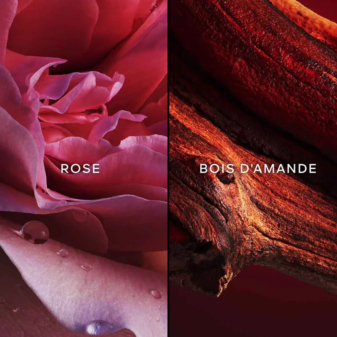 Les baies de cassis s’accordent au bois d’amandier tandis que la transparence de la rose adoucit l’envolée du mimosa. Le cœur délicat palpite avec les fleurs de mimosa. Le fond mêle les accents charnels de la graine d’hibiscus à la douceur du bois d’amandier.