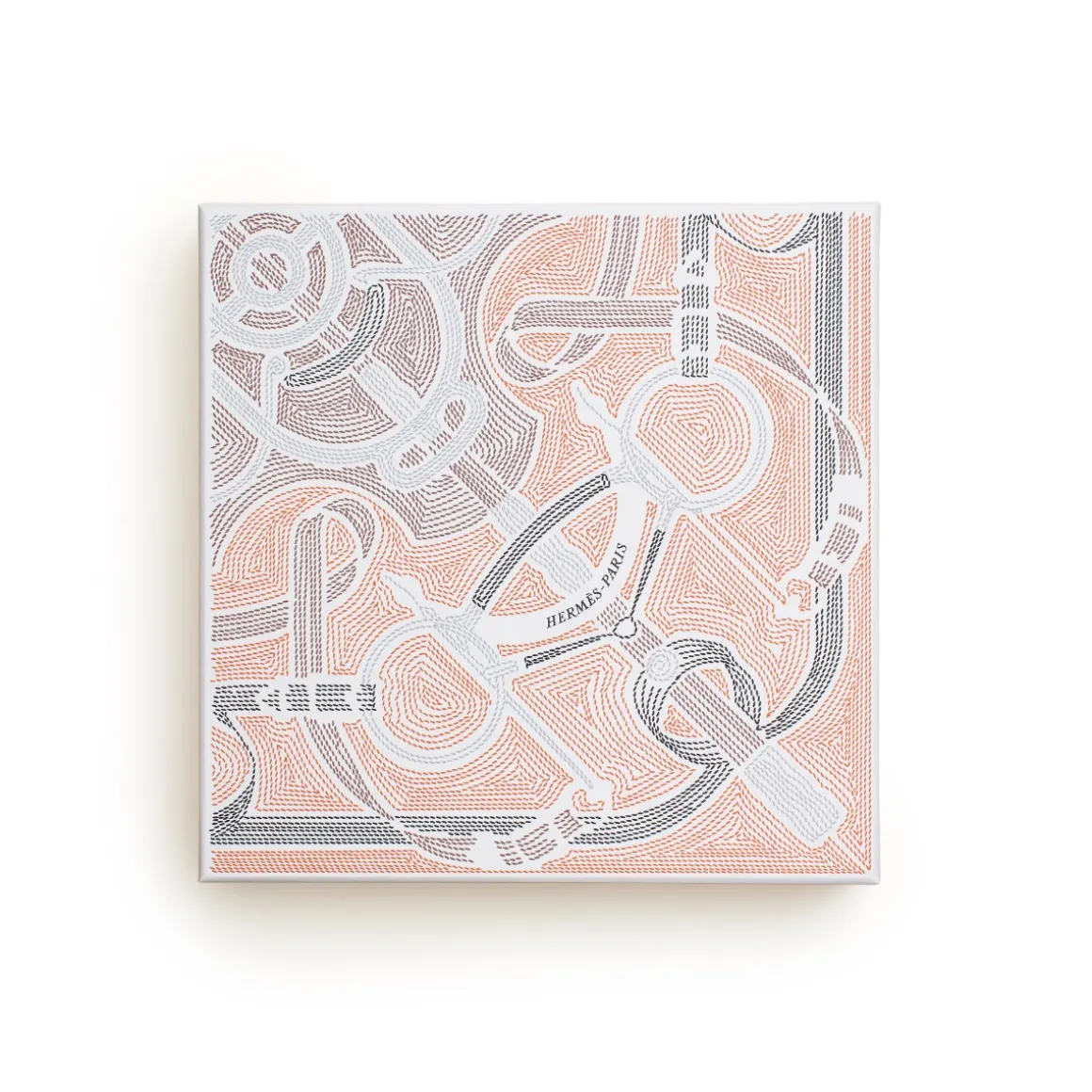 À l’occasion de la fête des Pères, les coffrets de parfums Hermès s’habillent du dessin « Éperon d’or sellier » signé Henri d’Origny. Un délicat labyrinthe de fils de couleurs, comme brodés au point sellier, laissent apparaître sur la boîte orange mors, boucles et éperons.
