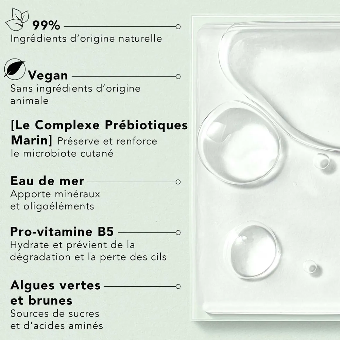 Composée à 99% d’ingrédients d’origine naturelle, Le Démaquillant Yeux élimine efficacement le maquillage tenace, même waterproof, tout en prenant soin des cils. Au coeur de sa formule, le Complexe Prébiotiques Marin préserve et renforce le microbiote cutané. Enrichi en Pro-Vitamine B5, pour hydrater et prévenir la dégradation et la perte des cils. Sa texture bi-phase allie l’efficacité démaquillante de l’huile à la fraîcheur de l’eau, sans laisser de film gras. Le contour des yeux est parfaitement démaquillé, hydraté et apaisé. Les cils sont protégés. Convient aux yeux sensibles et porteurs de lentilles. VEGAN* Testé sous contrôle ophtalmologique. Made in France. *Sans ingrédients d’origine animale