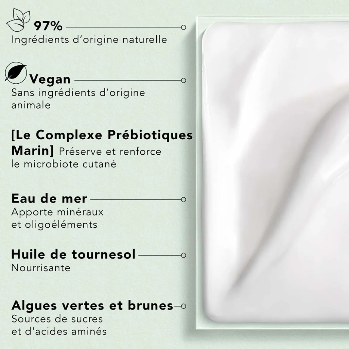 Composée à 97% d’ingrédients d’origine naturelle, Le Lait Démaquillant nettoie et démaquille en douceur le visage et les yeux en apportant un confort immédiat à la peau. Au coeur de sa formule, le Complexe Prébiotiques Marin préserve et renforce le microbiote cutané. Sa texture veloutée légère et non grasse enveloppe la peau d’un voile de douceur. Elle est parfaitement propre, souple et nourrie. Convient à tous les types de peaux, même sensibles. VEGAN* Testé sous controle dermatologique et ophtalmologique. Made in France *Sans ingrédients d’origine animale