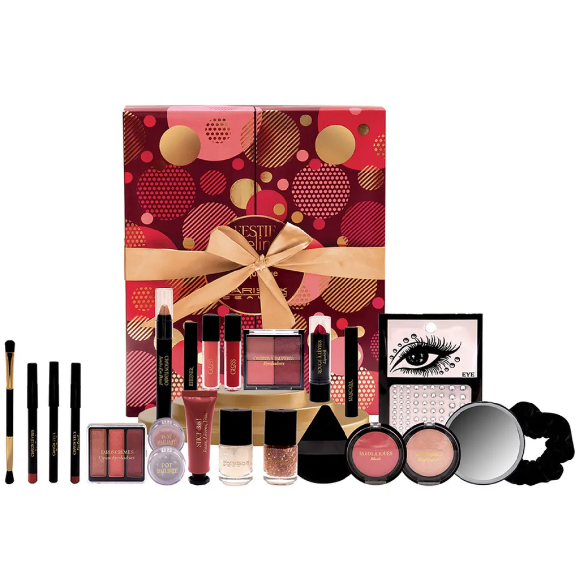 CALENDRIER DE L’AVENT MAQUILLAGE • FESTIF FEELING Faites-vous plaisir avant l’arrivée de Noël avec le calendrier Festif feeling en édition limitée. Jour après jour, découvrez 24 merveilleuses surprises maquillage & accessoires. Composé de: 1 Palette 4 Ombres à Paupières, 1 Palette Enlumineur, 1 Palette Fard à Joues, 1 Planche Strass, 1 Palette 3 Ombres à Paupières Crème, 2 Gloss, 1 Rouge à Lèvres, 1 Crayon Jumbo, 1 Stick 3 en 1, 1 Mascara, 1 Eyeliner, 1 Ombre à Paupières Liquide, 2 Pots Poudres Pailletées, 2 Crayons Yeux, 1 Crayon Lèvres, 2 Vernis à Ongles, 1 Miroir, 1 Pinceau Duo, 1 Grand élastique Cheveux, 1 Houppette Cosmétique. Dimensions: 24 x 29 x 7 cm.