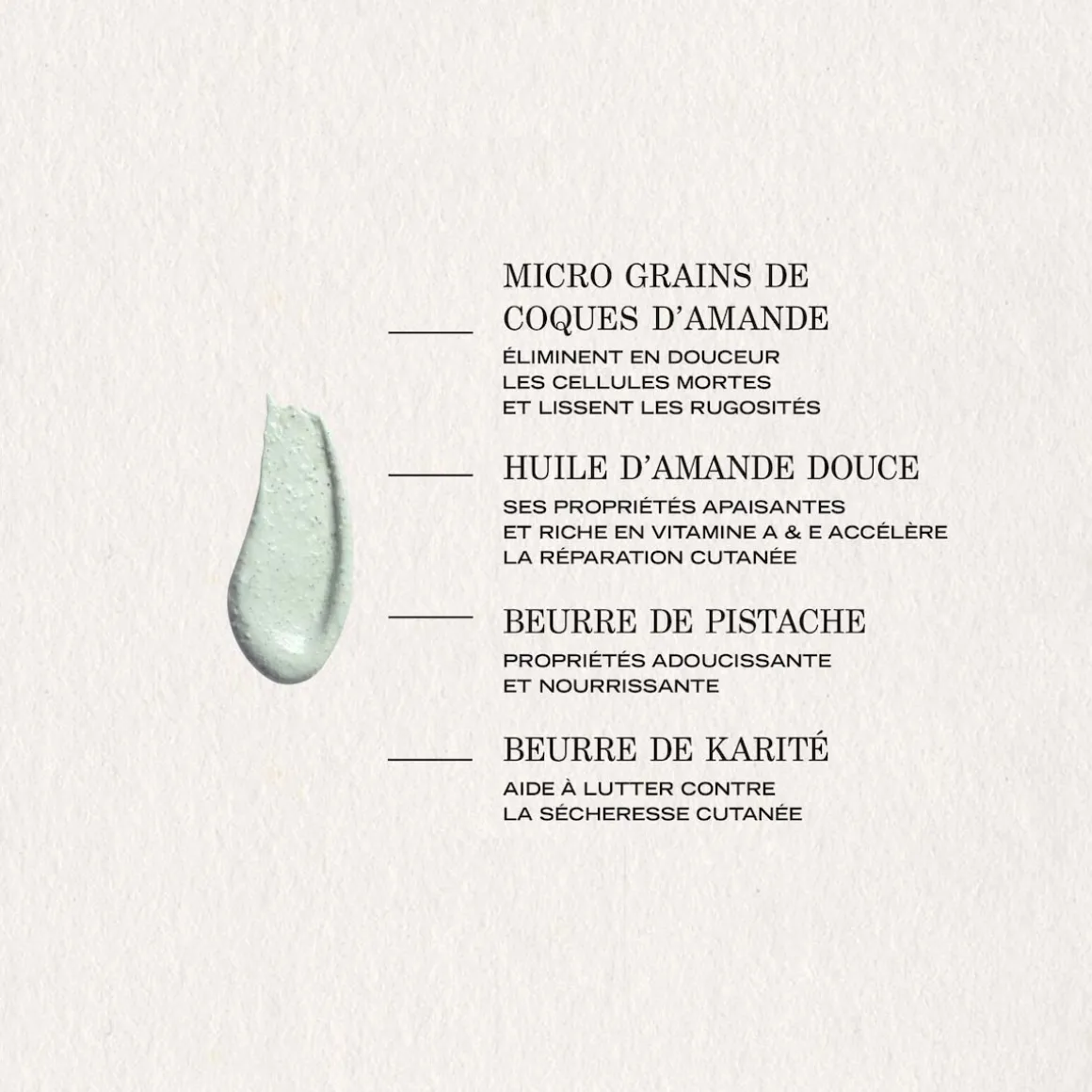 | Bénéfice produit | Le grain de peau est lisse, la peau assouplie et douce. |