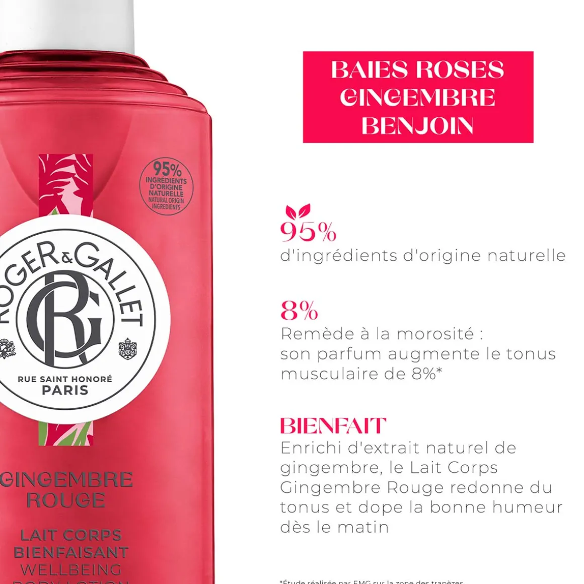 | Bénéfice produit | Naturellement énergisant Enrichi d’extrait naturel de gingembre, le Lait Corps Gingembre Rouge redonne du tonus et dope la bonne humeur dès le matin. Remède à la morosité, son parfum augmente le tonus musculaire de 8%.* *Étude réalisée par EMG sur la zone de la nuque. |