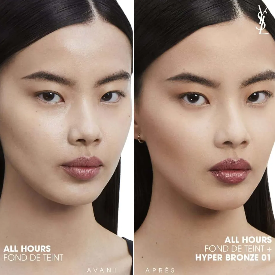 All Hours Hyper Bronze, la nouvelle poudre bronzante pour un fini Hyper naturel et lumineux & une Hyper tenue 24h. Grâce à ses hyper polymères, All Hours Hyper Bronze réchauffe le teint instantanément pour un effet halé naturel & un effet seconde peau immédiat.