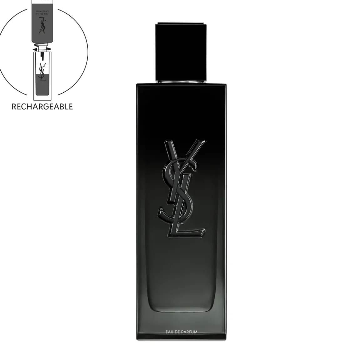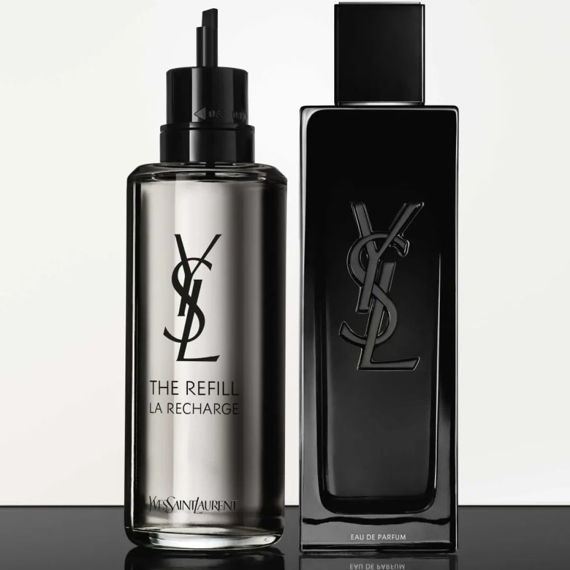 Tous les formats de MYSLF sont rechargeables. La recharge de l’Eau de Parfum permet d’économiser 43% de verre, 75% de métal, 21% de plastique, 16% de papier*.